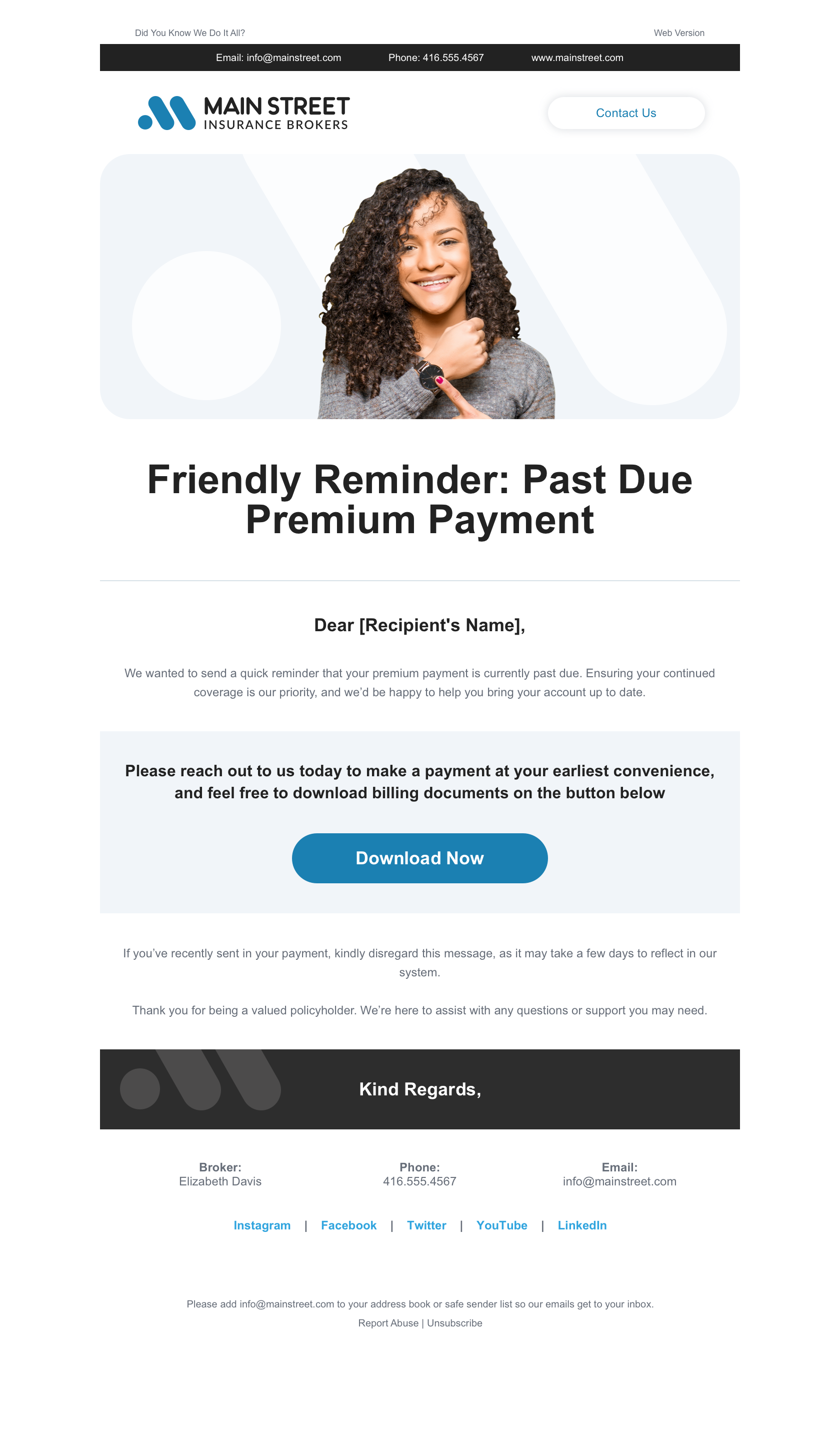 The email provides a gentle reminder that the premium payment is overdue, reinforcing the importance of maintaining active coverage. It encourages clients to act quickly to bring their account up to date and avoid any lapse in their policy.